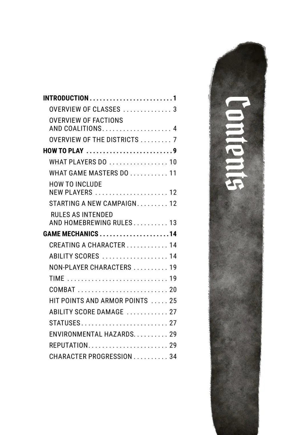 The book contains a complete game system as well as a lore-rich world with its own complete cosmology. The city contains eleven unique districts. There are nine playable classes (or twelve, if we reach our stretch goals) and twenty or so factions. The only other things you need to play Penumbra City are dice, pen and paper, a game master, a party, and to answer the call to adventure. And to not get eaten by a murderous swamp crane.
