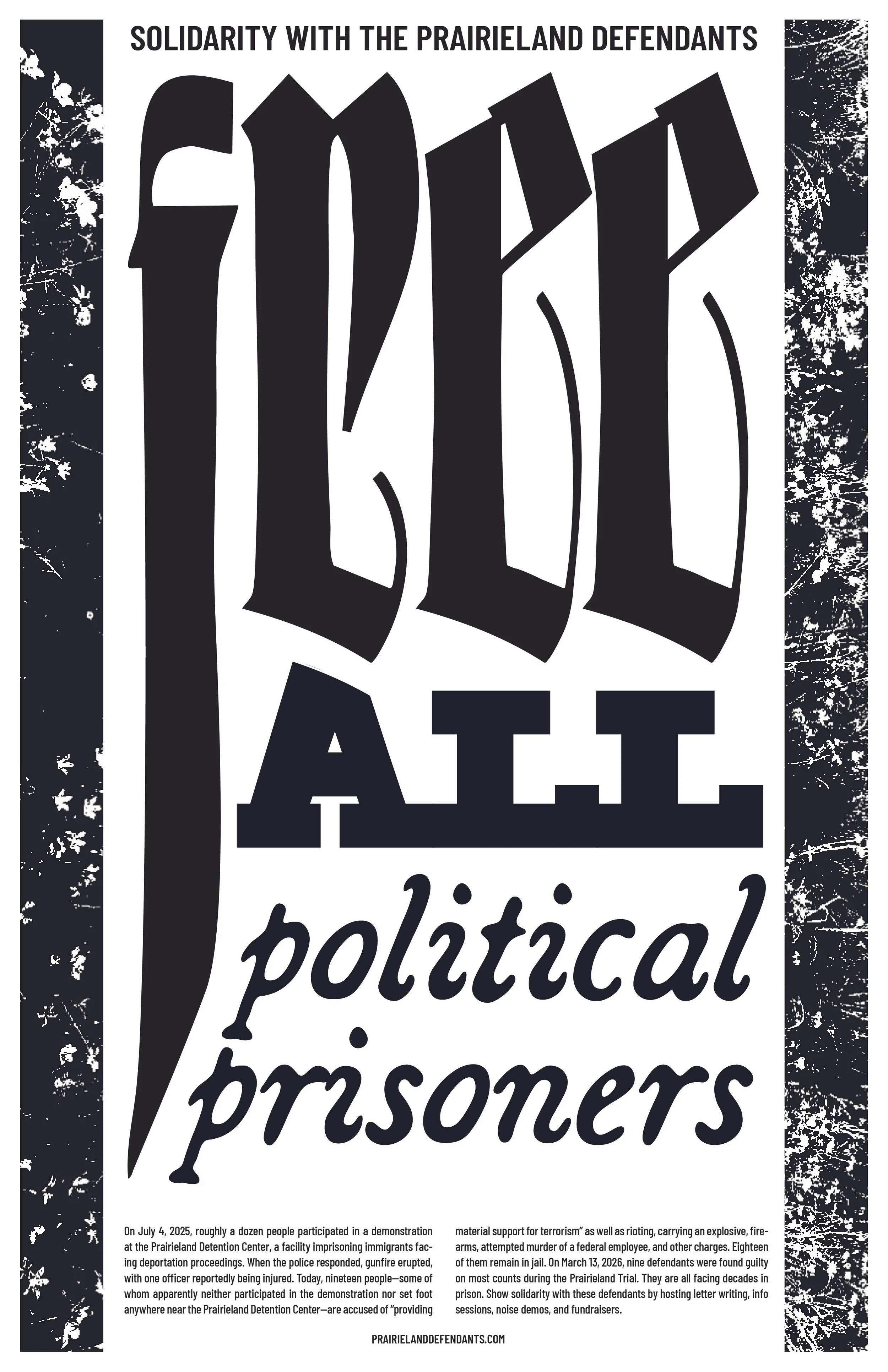 On July 4, 2025, roughly a dozen people participated in a demonstration at the Prairieland Detention Center, a facility imprisoning immigrants facing deportation proceedings. When the police responded, gunfire erupted, with one officer reportedly being injured. Today, nineteen people—some of whom apparently neither participated in the demonstration nor set foot anywhere near the Prairieland Detention Center—are accused of “providing material support for terrorism” as well as rioting, carrying an explosive, firearms, attempted murder of a federal employee, and other charges. Eighteen of them remain in jail. On March 13, 2026, nine defendants were found guilty on most counts during the Prairieland Trial. They are all facing decades in prison. Show solidarity with these defendants by hosting letter writing, info sessions, noise demos, and fundraisers.