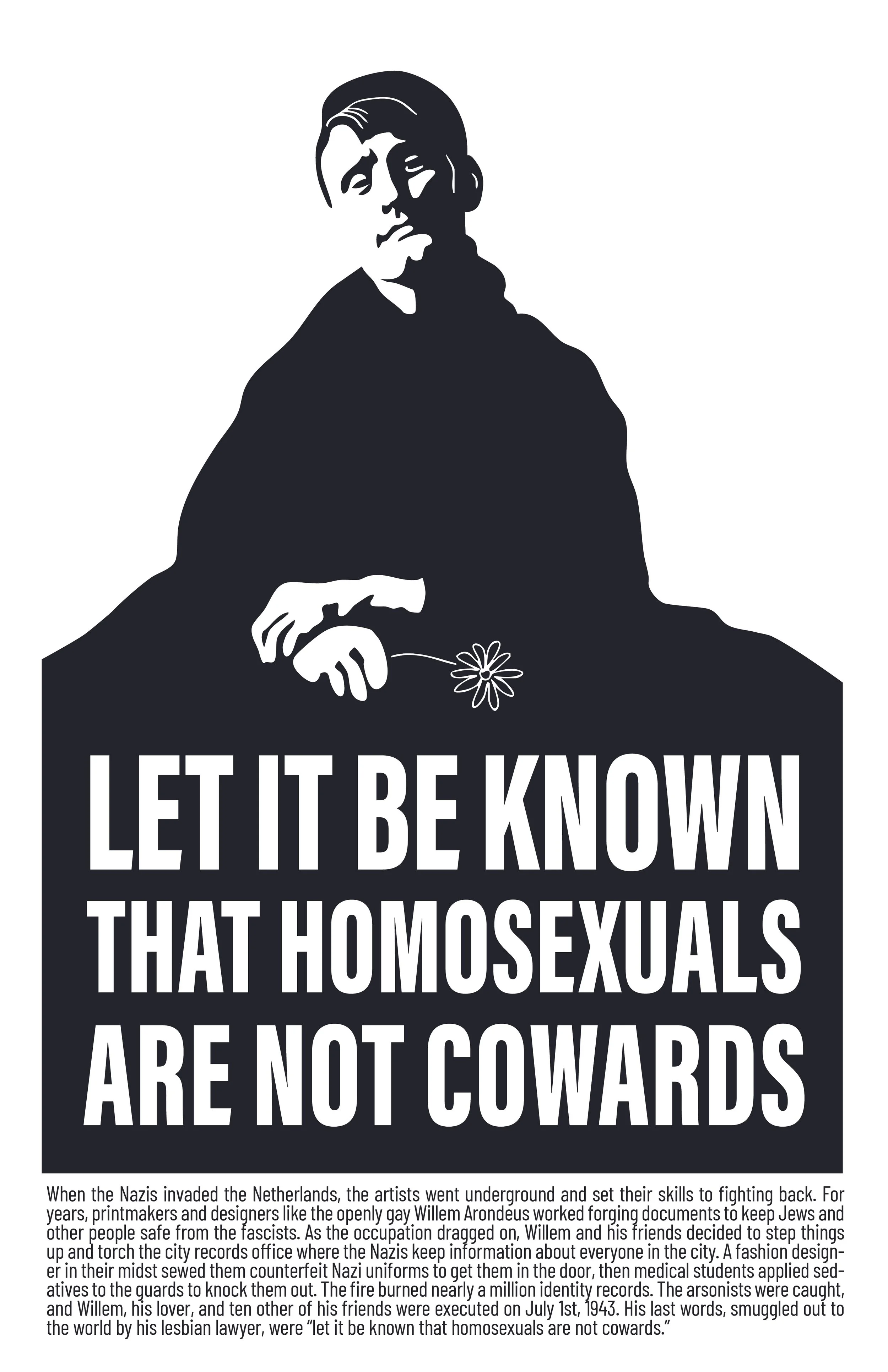When the Nazis invaded the Netherlands, the artists went underground and set their skills to fighting back. For years, printmakers and designers like the openly gay Willem Arondeus worked forging documents to keep Jews and other people safe from the fascists. As the occupation dragged on, Willem and his friends decided to step things up and torch the city records office where the Nazis keep information about everyone in the city. A fashion designer in their midst sewed them counterfeit Nazi uniforms to get them in the door, then medical students applied sedatives to the guards to knock them out. The fire burned nearly a million identity records. The arsonists were caught, and Willem, his lover, and ten other of his friends were executed on July 1st, 1943. His last words, smuggled out to the world by his lesbian lawyer, were “let it be known that homosexuals are not cowards.”